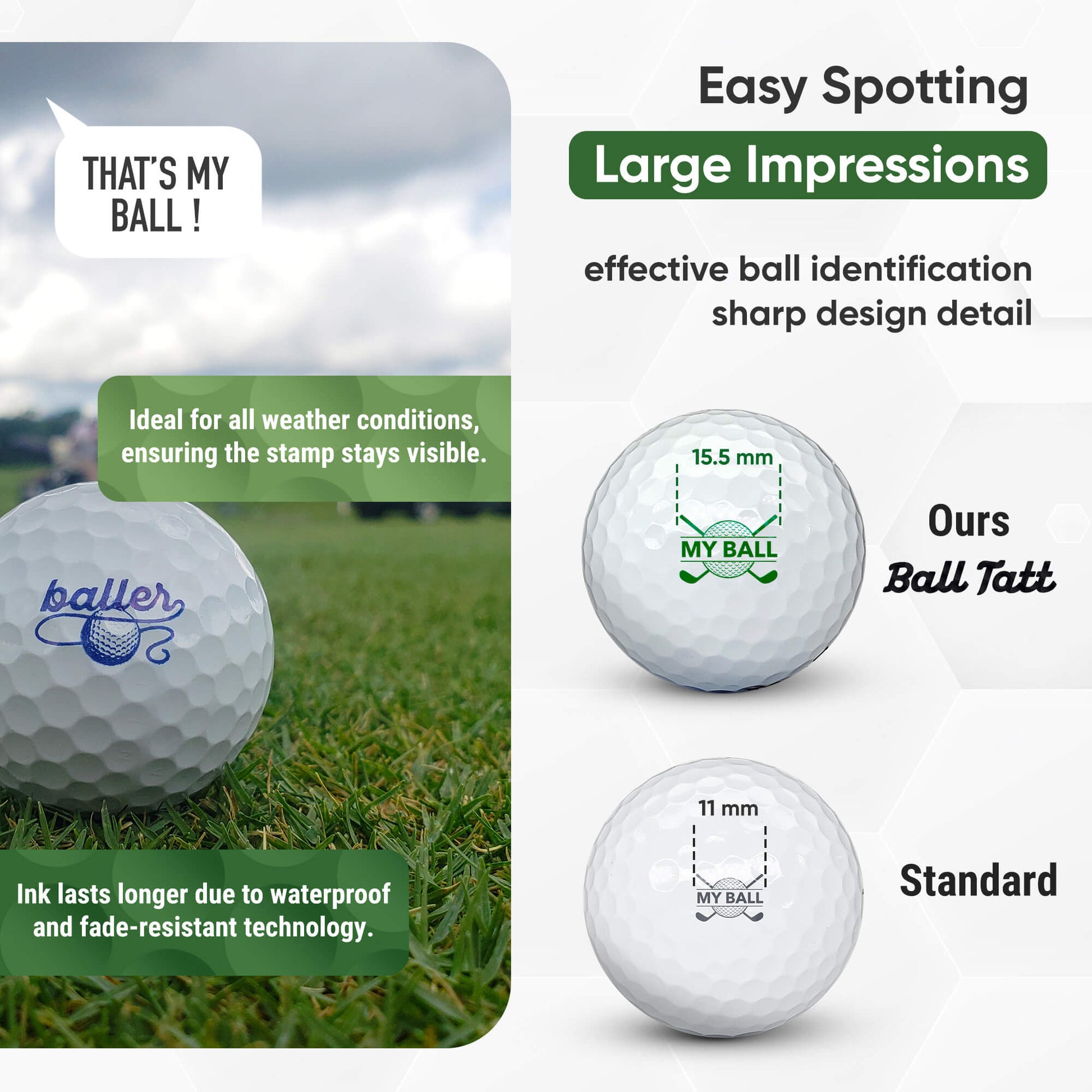Up to 50% larger & easier to recognize than most golf ball stamps our 0.75" x 0.5" stamper pad delivers vibrant clear imprints.