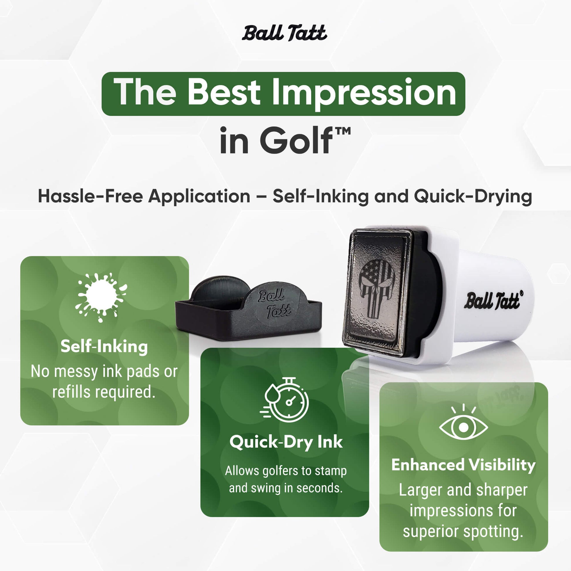 Waterproof & fade resistant, our quick dry stamping ink is less prone to smudging and designed to outlast the life of the golf ball.