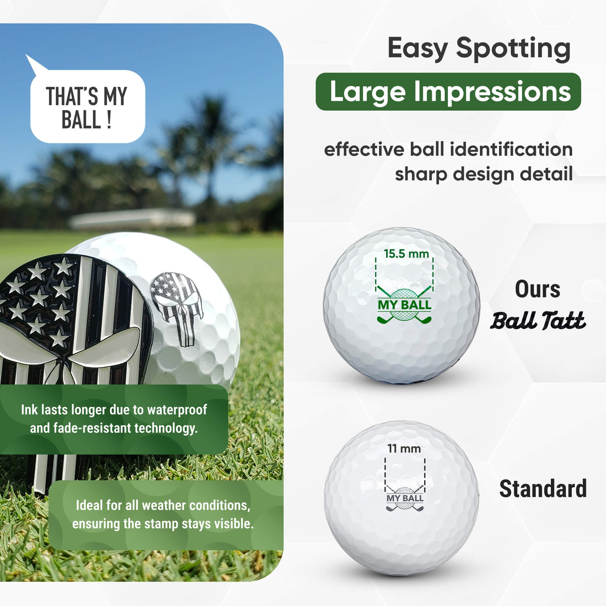 - BIGGER, WIDER, EASIER TO SPOT: Up to 50% larger & easier to recognize than most golf ball stamps! 0.75” x 0.5” golf ball stamper pad imprints BIG permanent impressions for fast & easy ball identification.