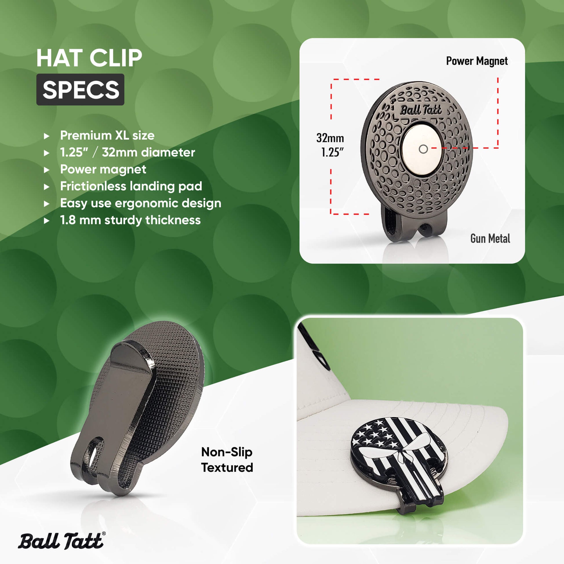- 1.25" DIAMETER HAT CLIP: Power magnetic with larger landing pad designed for easy snap on and removal of custom sized ball markers - gun metal nickel.