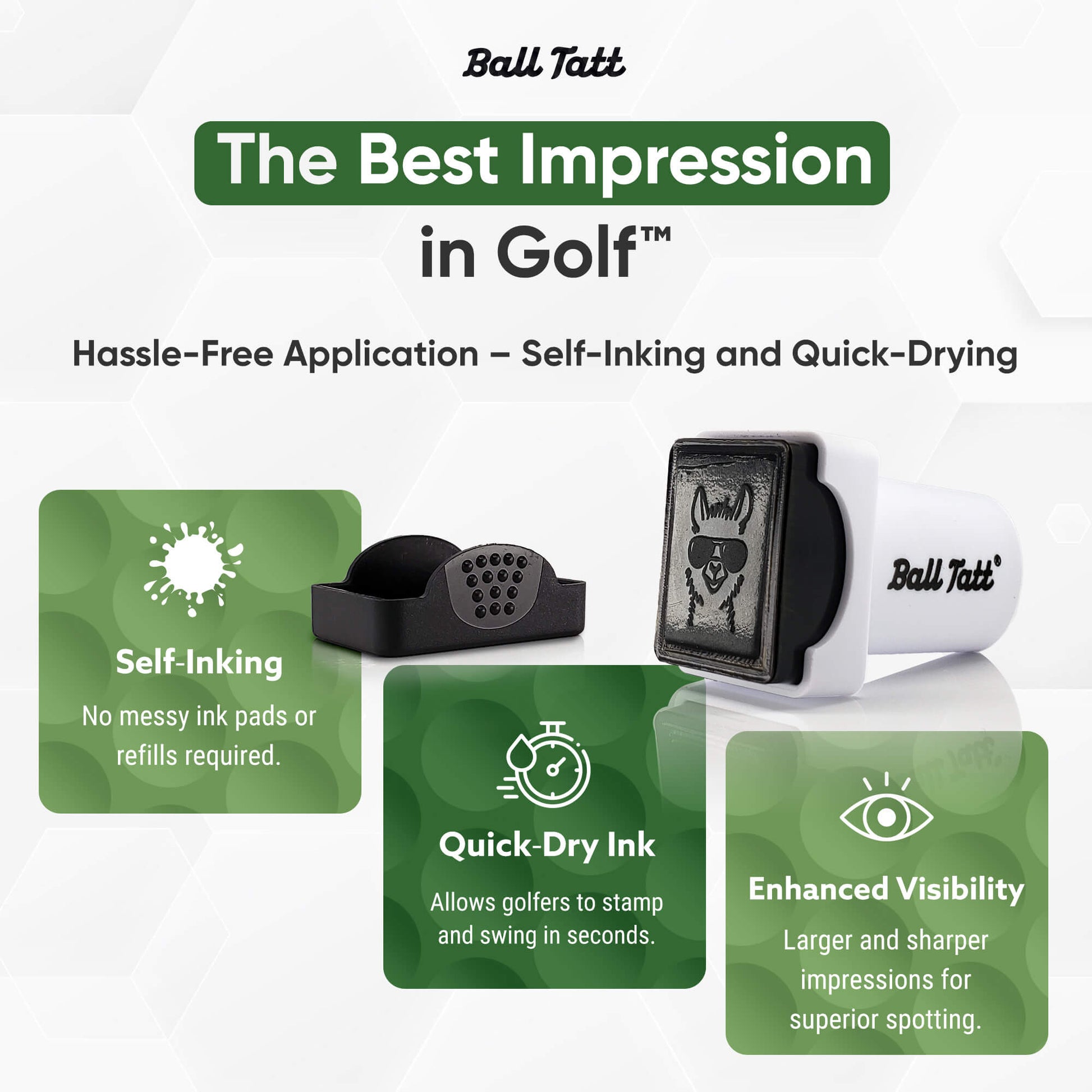 Stamp on and stand out with BALL TATT. Our large self-inking golf ball stamp offers clearly visible marking, while the fast-drying formula delivers smudge-free, long-lasting waterproof and fade proof imprints. No messy refills required and enough ink to last the season. Choose a from our great selection of designs.
