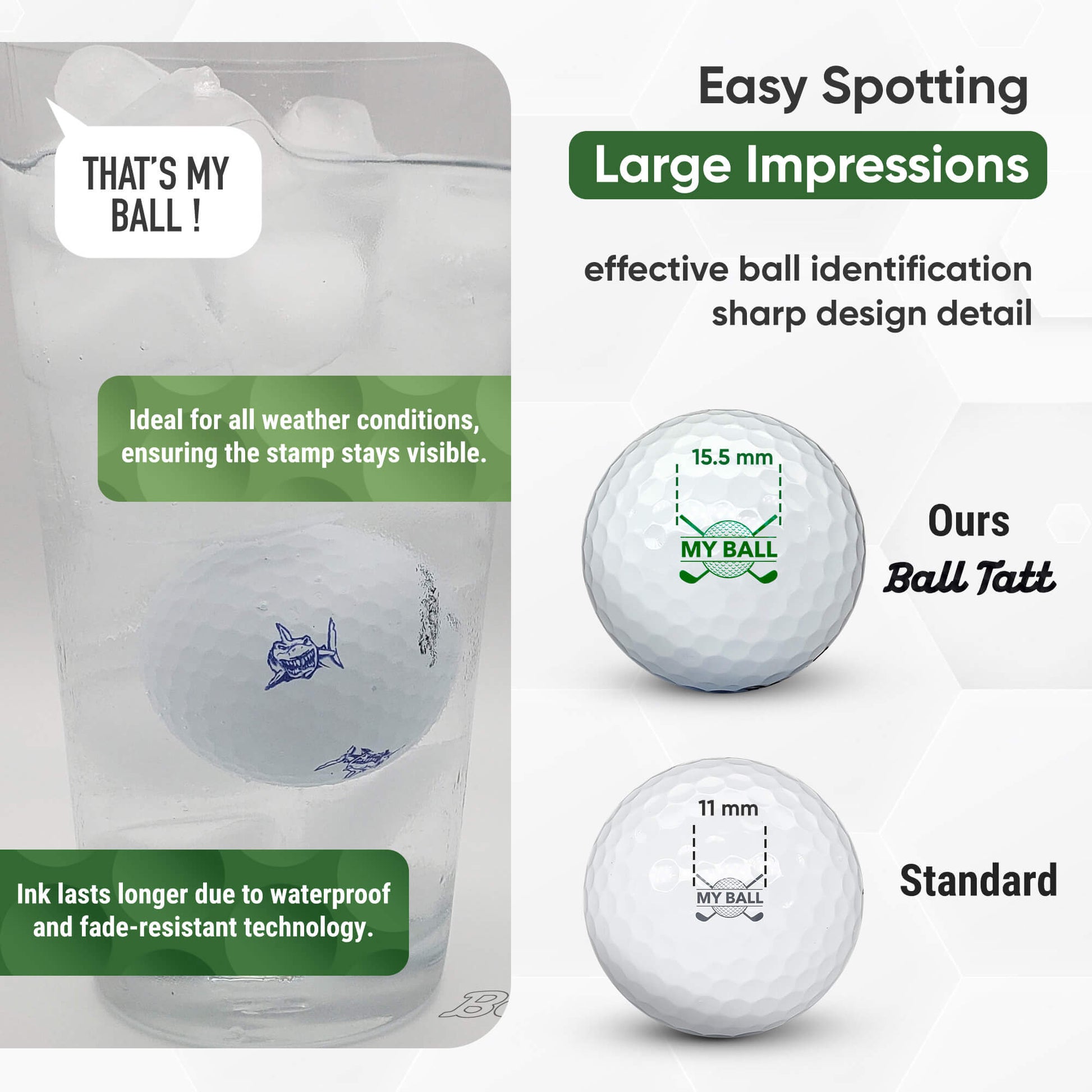 Waterproof & fade resistant, our quick dry stamping ink is less prone to smudging and designed to outlast the life of the golf ball.
